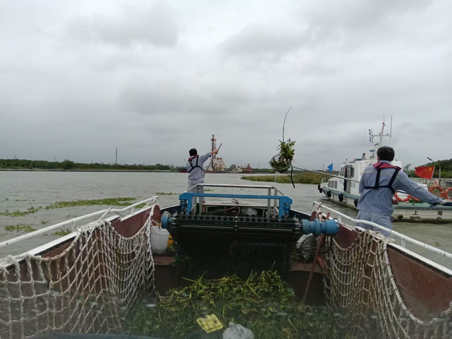 工作人员打捞水葫芦。 来源:上海水域环境保洁分公司